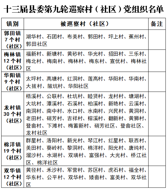 本轮巡察将从6月上旬开始至9月上旬,对县自然资源局、县琴江新城发展中心、水寨中学、安流镇中心卫生院、县审计局、安流中学、龙村镇中心卫生院、县政务数据管理局、龙村中学等9个单位和6个乡镇的89个村(社区)党组织开展巡察。