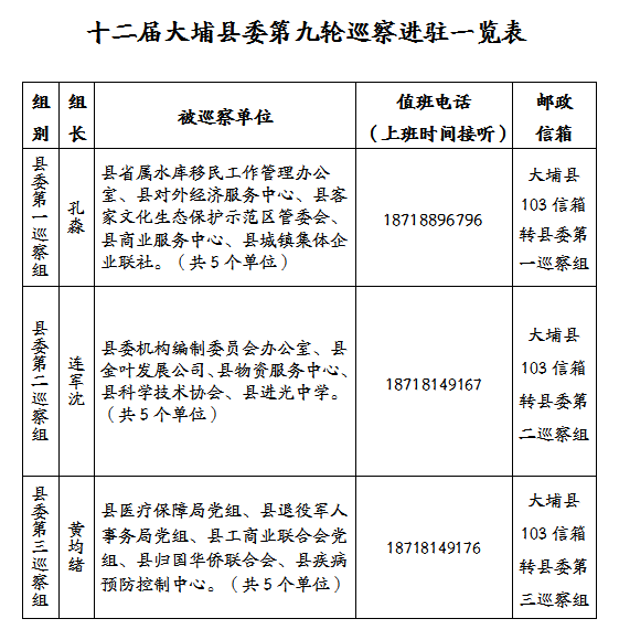 根据县委巡察工作部署,第九轮巡察工作从2020年10月底开始至明年1月底结束,为期约3个月。县委3个巡察组分别对县委机构编制委员会办公室、县医疗保障局党组、县退役军人事务局党组、县商业服务中心、县对外经济服务中心、县省属水库移民工作管理办公室、县物资服务中心、县城镇集体企业联社、县金叶发展公司、县客家文化生态保护示范区管委会、县进光中学、县疾病预防控制中心、县工商业联合会党组、县归国华侨联合会、县科学技术协会等15个县直单位党组织开展巡察。