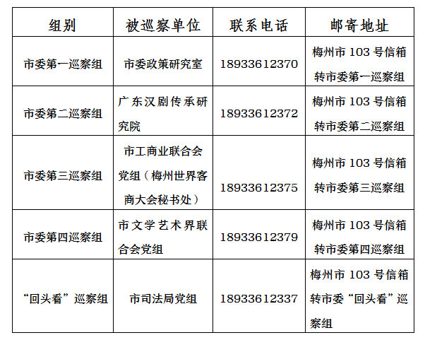 本轮巡察至今年12月底结束。巡察期间市委各巡察组设专门联系电话和邮政信箱,主要受理反映被巡察单位党组织领导班子及其成员、下属单位主要负责人和重要岗位党员干部问题的来信来电来访。市委各巡察组巡察对象、联系电话、邮寄地址公布如下: