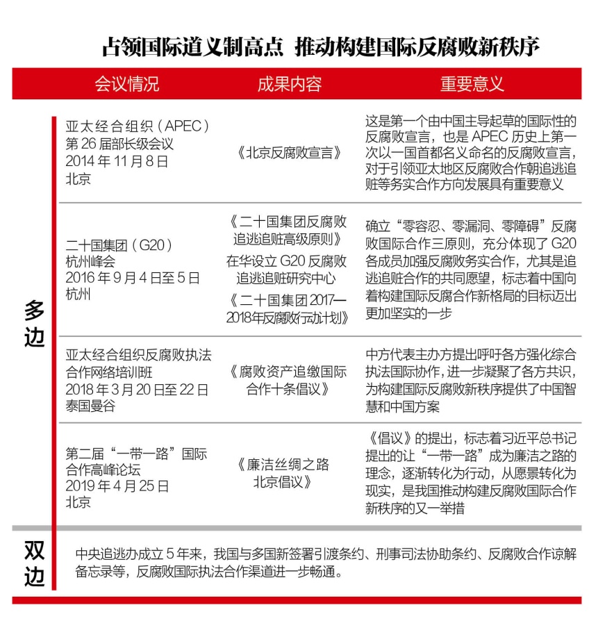 三是深化国际合作,构建国际反腐败新秩序。坚持以元首外交为引领,充分利用重大多边外交场合,凝聚各方共识,积极参与制定相关规则,为全球反腐败治理贡献中国智慧和中国方案。推动联合国、二十国集团、亚太经合组织等建立反腐败合作机制,主导制定亚太经合组织《北京反腐败宣言》、二十国集团《反腐败追逃追赃高级原则》,确立以“零容忍、零漏洞、零障碍”为主要内容的10条原则,设立二十国集团反腐败追逃追赃研究中心,提出亚太经合组织《腐败资产追缴国际合作十条倡议》,发起《廉洁丝绸之路北京倡议》,健全反腐败执法多边合作网络。与美国、加拿大、澳大利亚、新西兰等国建立双边执法合作机制,与菲律宾、泰国等国反腐败机构签订反腐败合作谅解备忘录,为追逃追赃工作争取最广泛的国际支持。