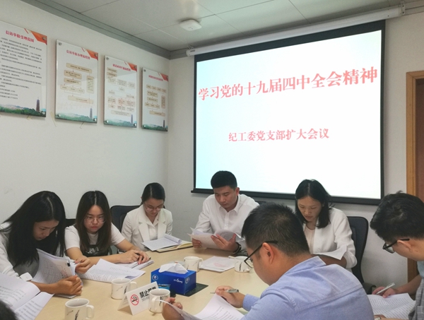 深圳市龙华街道纪工委党支部召开扩大会议,组织全体党员同志认真学习研读十九届四中全会公报。