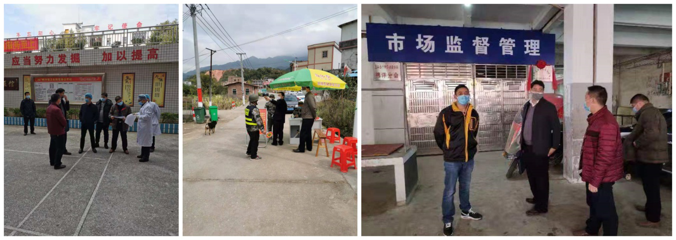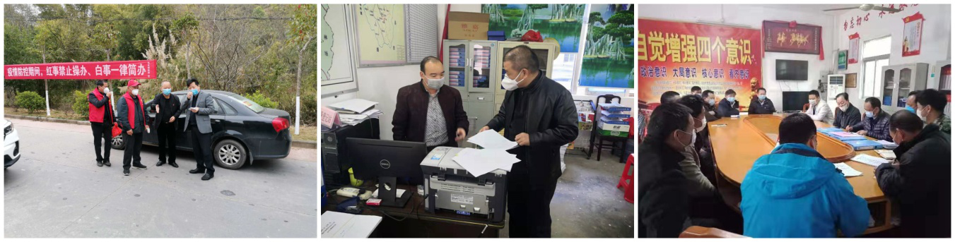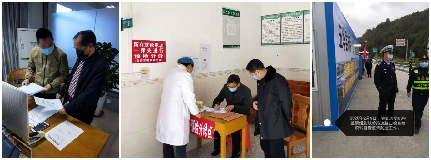 (图为水寨镇〈左上〉、龙村镇〈左下〉、岐岭镇〈右〉纪委干部到村(居)委检查落实防控工作)